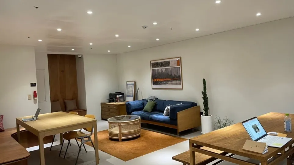 동교맨션에 사시는 멤버분들의 주방이자 거실로 활용되는 라운지입니다. 큰 테이블 2개가 있어 10명 정도 앉으실 수 있어요. 가정집에서 편하게 일하는 느낌을 찾으시는 분들이나, 멤버분들이 돌봐주시는 길고양이 가족과 인사나누고 싶으신 분들께 추천드려요.