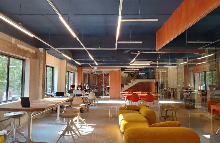 업무에 집중할 수 있는 1-2인용 테이블 7개와, 식사하거나 편하게 대화를 나눌 수 있는 큰 테이블, 푹신한 소파가 있어 다양한 자세로 편하게 일할 수 있어요. 출출하거나 커피가 생각날때, 바로 아래 1층 슈퍼스티치를 이용할 수 있어 더욱 매력적인 공간이에요.