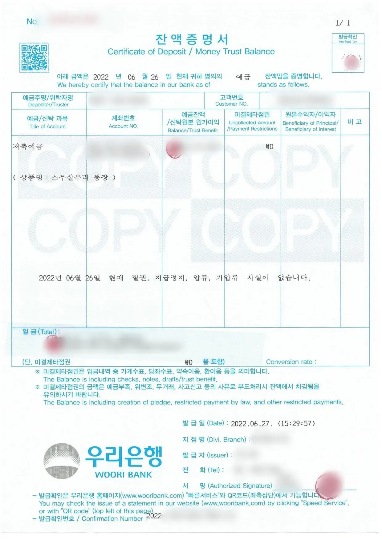 Giấy xác nhận số dư tài khoản (10 triệu won)