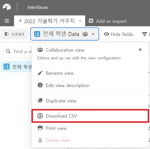 3. Base 에서는 자세한 정보가 확인 가능하며, CSV 형태로 다운로드 가능. 전체 학생 data를 마우스 우클릭 하시면, 다운받기가 나옵니다.