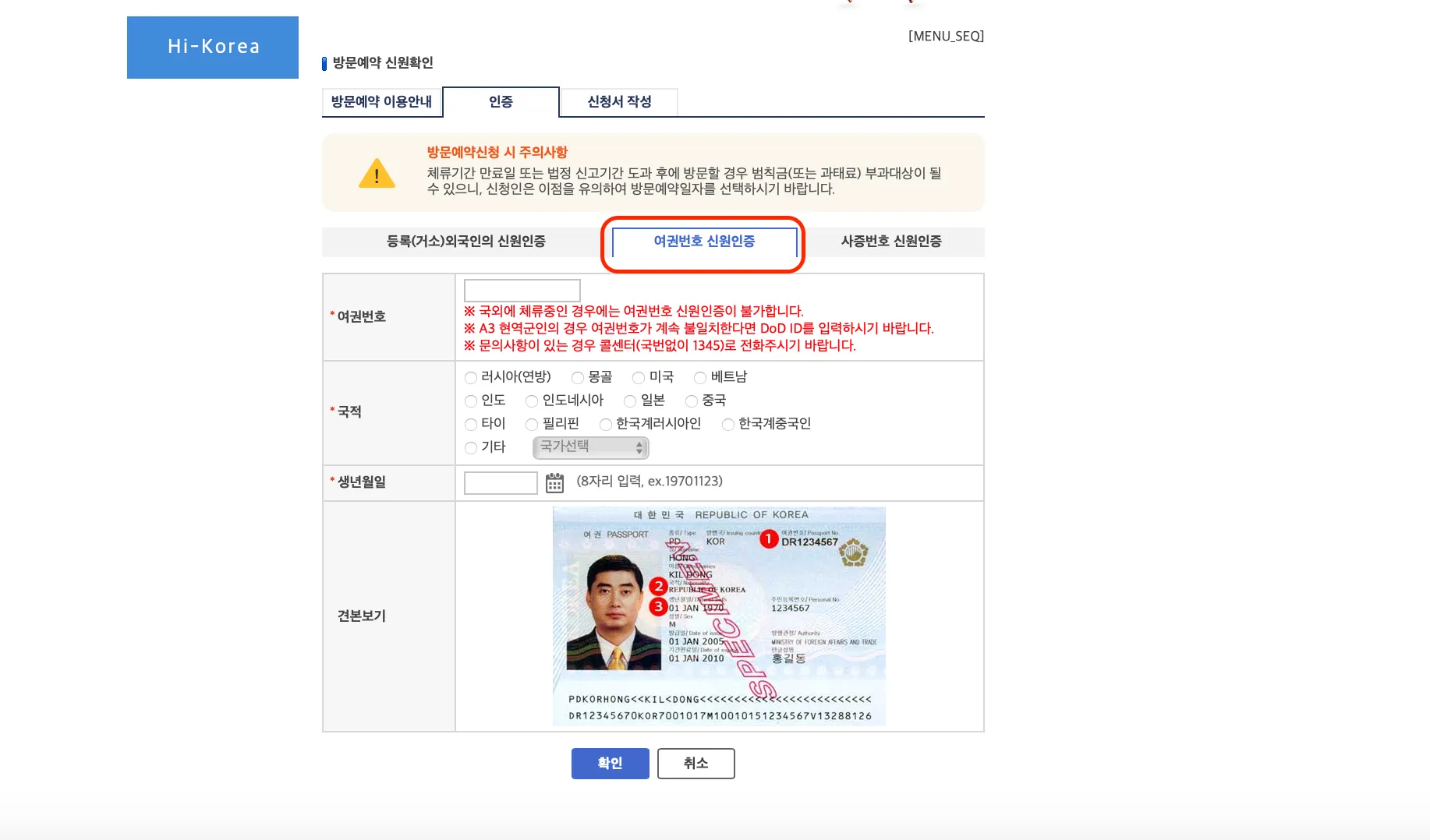 3. 인증단계에서 "여권번호 신원인증" 선택. 여권번호, 국적, 생년월일 입력.