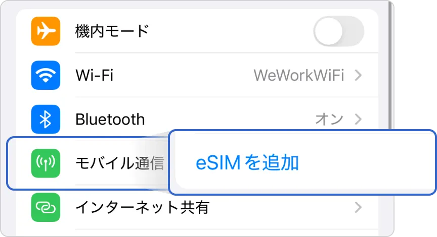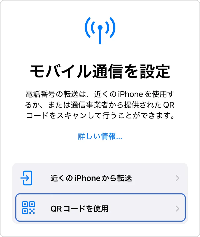 1. 「設定」→「モバイル通信」→「eSIMを追加」→「QRコードを使用」をタップしてください。