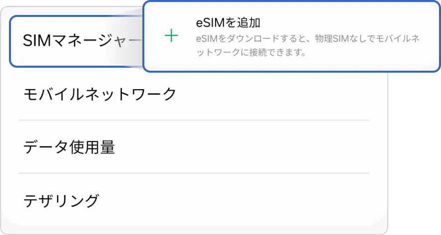 1. 「設定」→「接続」→「SIMマネージャー」→「eSIMを追加」をタップしてください。