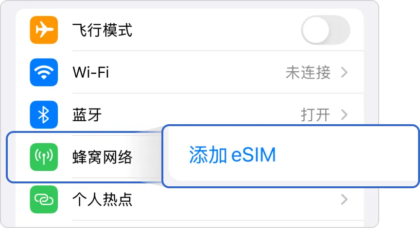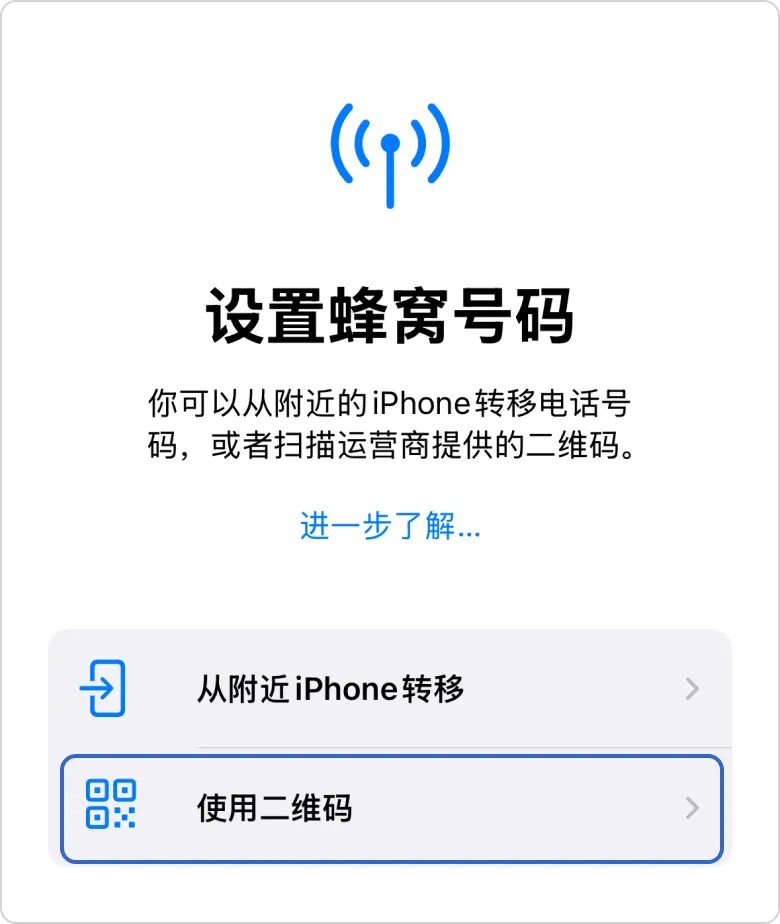1. 前往“设置”→“蜂窝网络”→“添加eSIM”→ 点击“使用二维码”。