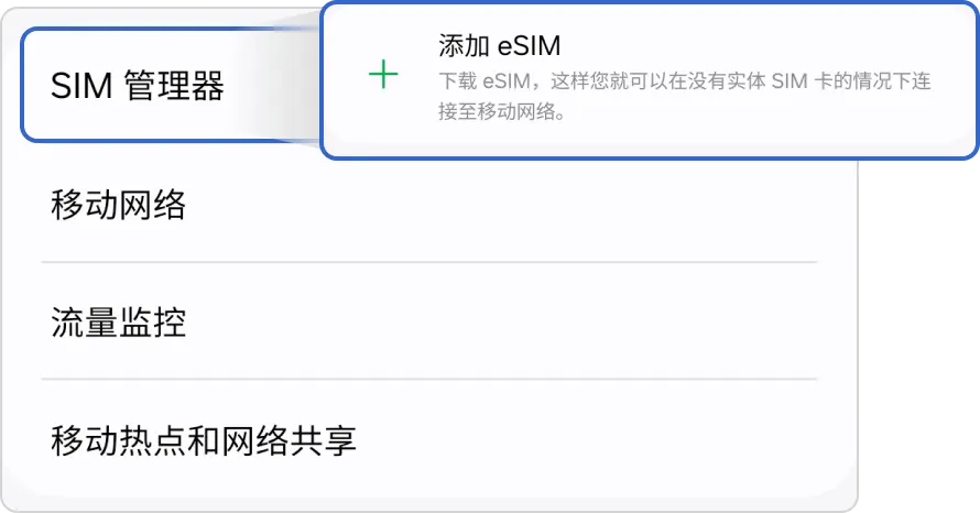 1. 前往“设置”→“连接”→“SIM卡管理器”→ 点击“添加eSIM”。
