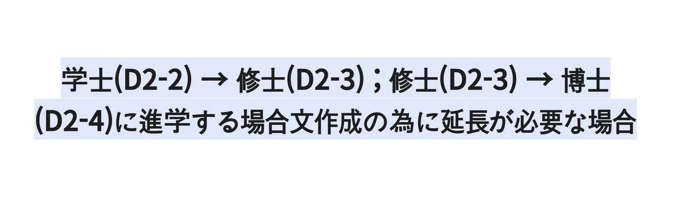 学士(D2-2) → 修士(D2-3) ; 修士(D2-3)→ 博士(D2-4)へ変更する場合、開講日より15日以内に滞留期間延長を申し込まなければなりませんのでご注意ください