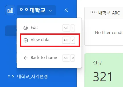 1. 첫페이지에서 원하시는 탭을 클릭 후 상황 확인, interface 는 간단한 정보만 확인 가능. 왼쪽 상단학교 명칭 버튼을 누르시면 View data로 이동하면 자세한 EXCEL 형태의 자료를 확인하실 수 있습니다.