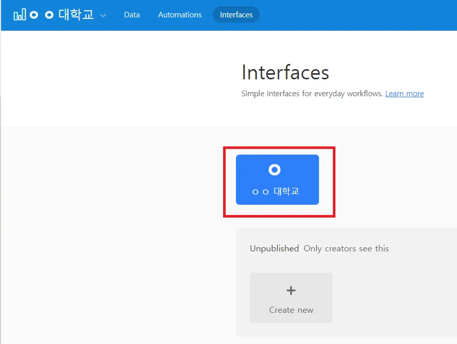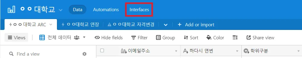 3. interface 로 돌아가시려면 먼저 상단 버튼Interfaces을 눌러주신 다음에 학교 명칭 버튼을 눌러주시면 됩니다.