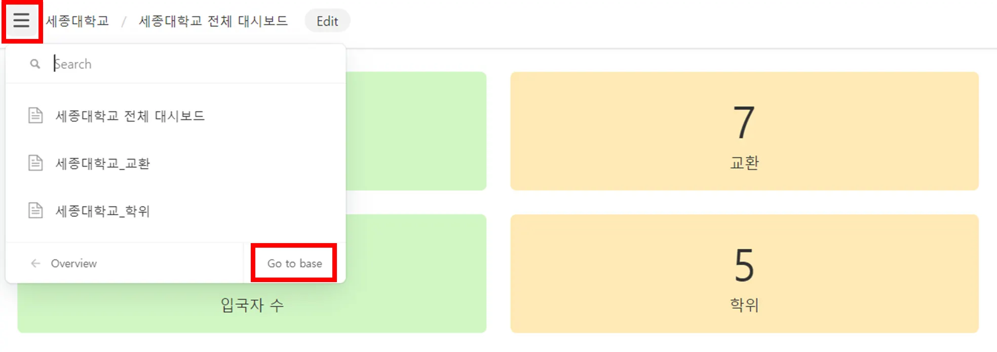 interface 는 간단한 정보만 확인 가능. 왼쪽 상단끝 목록을 누르시면 go to base로 이동하면