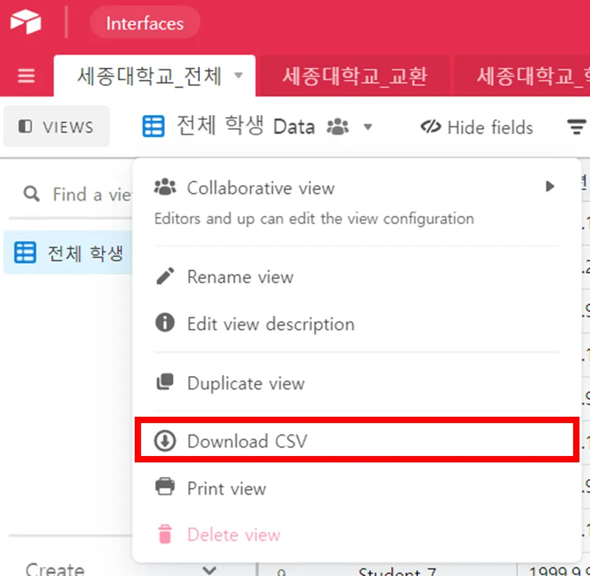 3. Base 에서는 자세한 정보가 확인가능하며, CSV 형태로 다운로드 가능. 전체학생 data를 마우스 우클릭 하시면, 다운받기가 나옵니다.